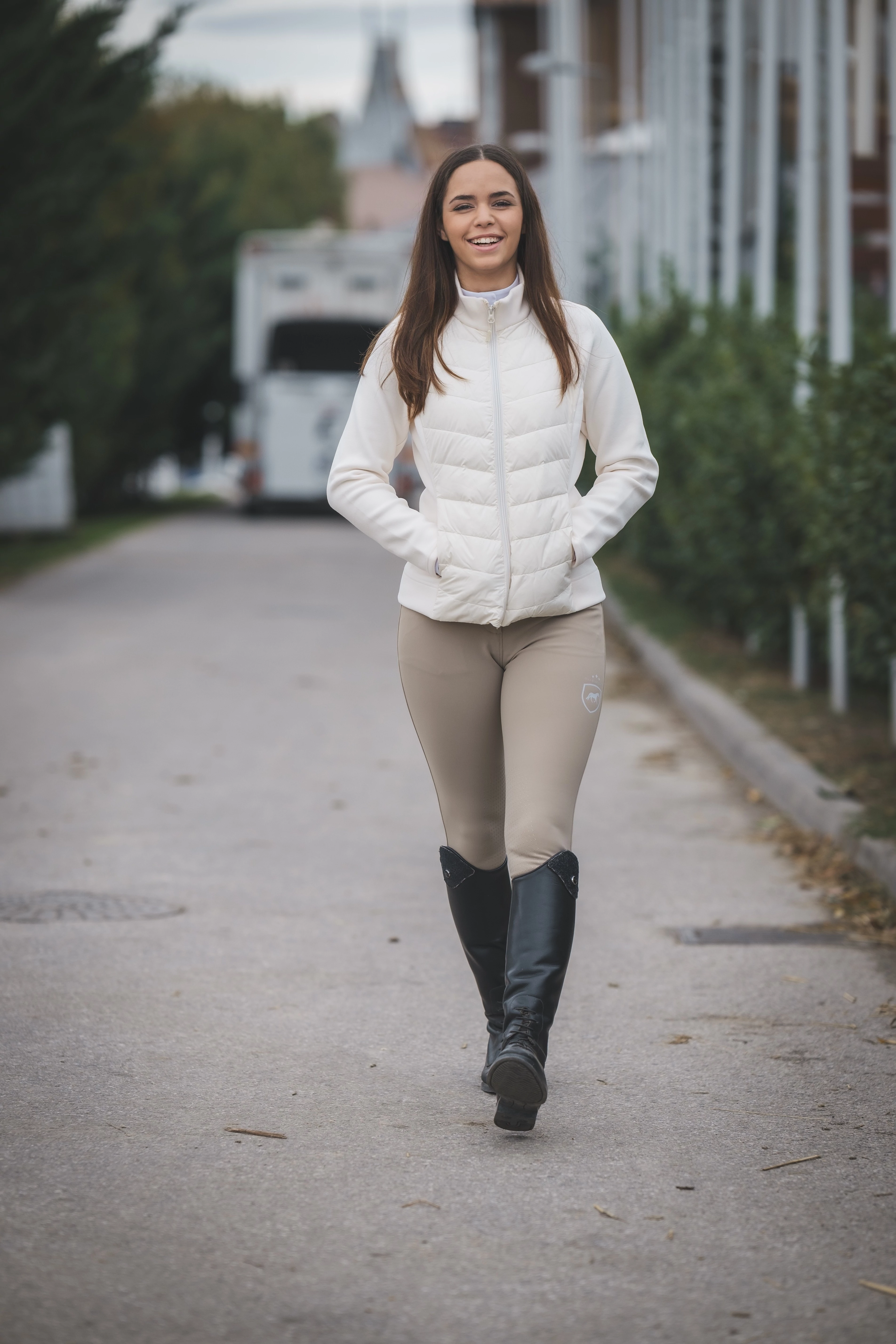 A Snowfall Jacket kabát nőies elegancia és sportos funkcionalitás tökéletes kombinációja. Könnyű, mégis melegen tart a hűvös reggeleken, miközben szabad mozgást biztosít lovaglás közben.